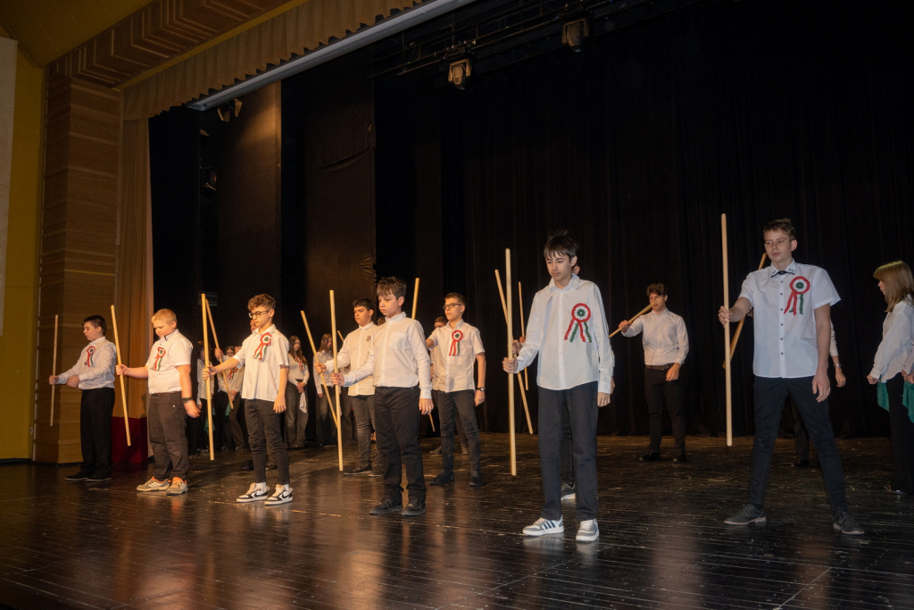 Az 1848-49-es forradalom és szabadságharc eseményeire és fontos szereplőire egy rendkívül változatos és látványos műsor keretében emlékeztünk meg a 7.n osztályos diákok előadásában. A Dr. Csernák-Szuhánszki Debóra tanárnő által színpadra álmodott produkcióban 1848 értékeit, jelentőségét fogalmazták meg a szereplők. Az előadásban az osztály valamennyi tanulója részt vett, és mindannyian magas szintű előadói képességükről tettek tanúbizonyságot. A produkcióban felcsendülő dalokat Bazsó Boglárka tanárnő, a tánc koreográfiát Kovács Viktória tanárnő tanította be a szereplőknek. A műsor szervezésében osztályfőnökük, Gyeneiné Rada Beáta tanárnő is részt vett. A hangosításban a 9.n osztályból Kovács Ákos és Brunner Andor segédkezett. Hálásan köszönjük valamennyi közreműködőnek az emlékezetes műsort! A diákok igazgatói dicséretben részesülnek.