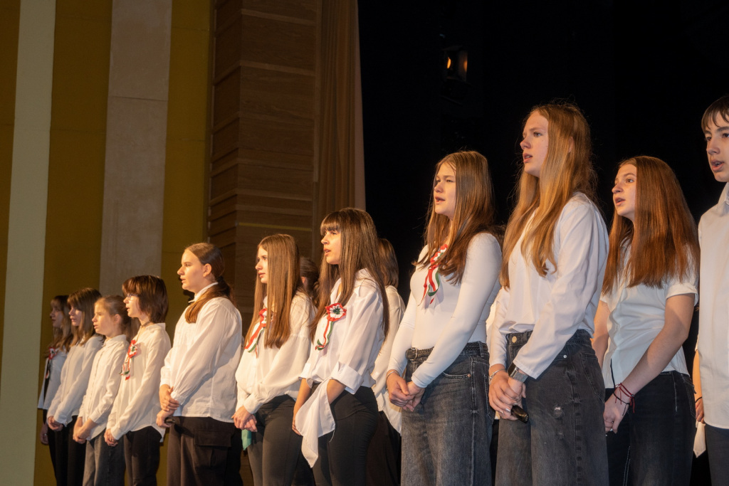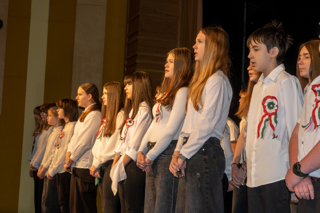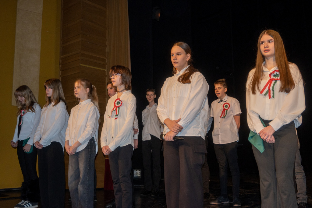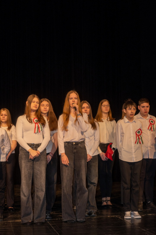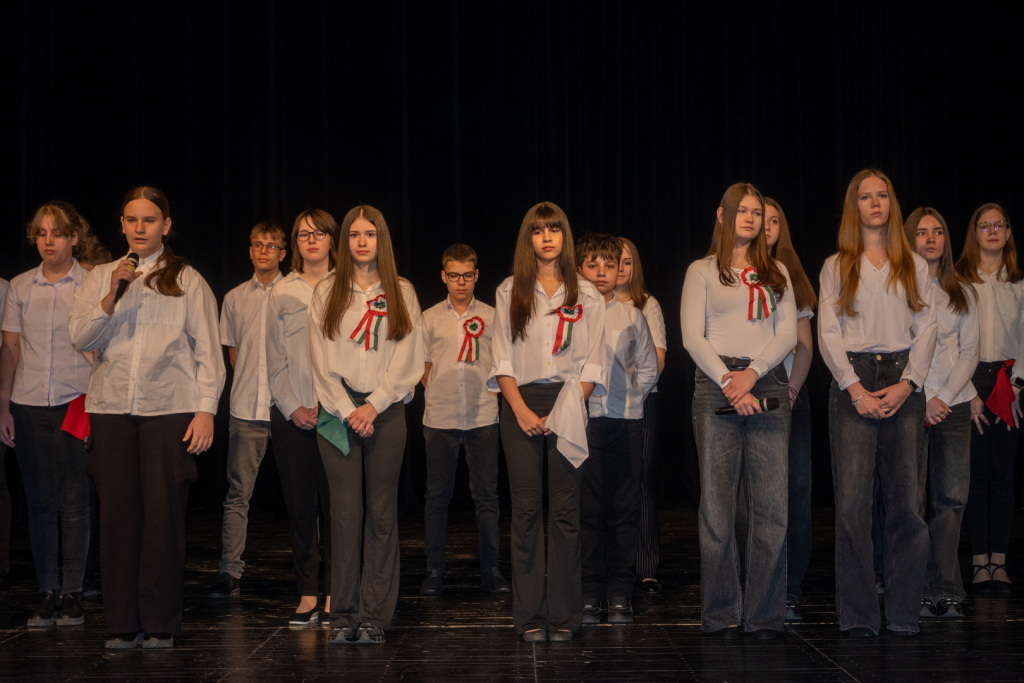 Az 1848-49-es forradalom és szabadságharc eseményeire és fontos szereplőire egy rendkívül változatos és látványos műsor keretében emlékeztünk meg a 7.n osztályos diákok előadásában. A Dr. Csernák-Szuhánszki Debóra tanárnő által színpadra álmodott produkcióban 1848 értékeit, jelentőségét fogalmazták meg a szereplők. Az előadásban az osztály valamennyi tanulója részt vett, és mindannyian magas szintű előadói képességükről tettek tanúbizonyságot. A produkcióban felcsendülő dalokat Bazsó Boglárka tanárnő, a tánc koreográfiát Kovács Viktória tanárnő tanította be a szereplőknek. A műsor szervezésében osztályfőnökük, Gyeneiné Rada Beáta tanárnő is részt vett. A hangosításban a 9.n osztályból Kovács Ákos és Brunner Andor segédkezett. Hálásan köszönjük valamennyi közreműködőnek az emlékezetes műsort! A diákok igazgatói dicséretben részesülnek.