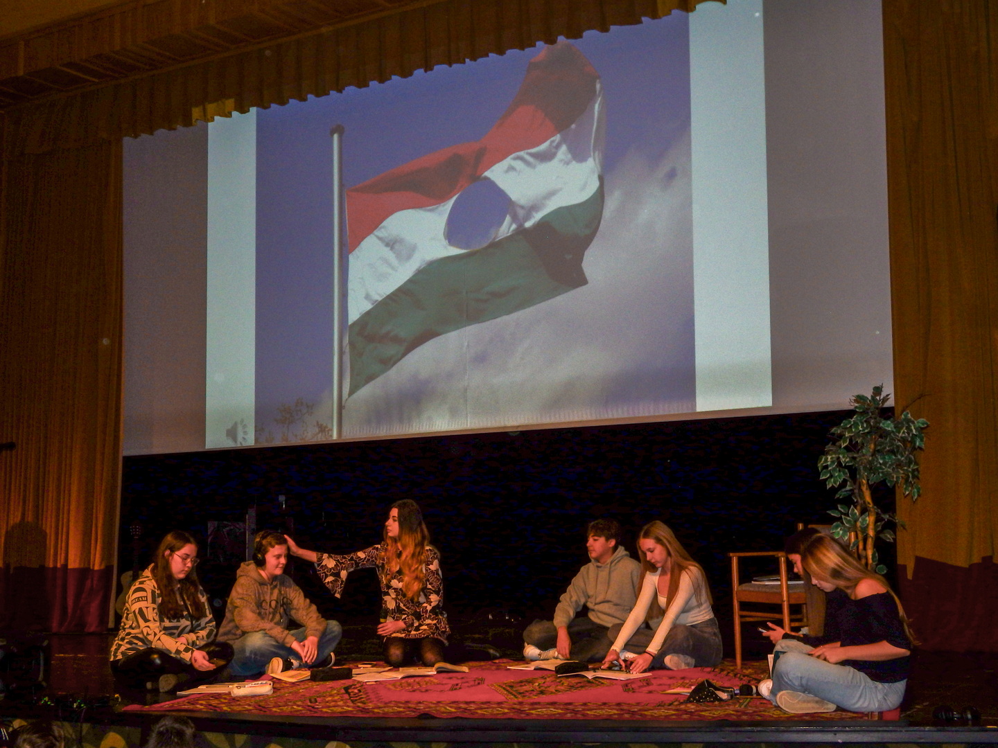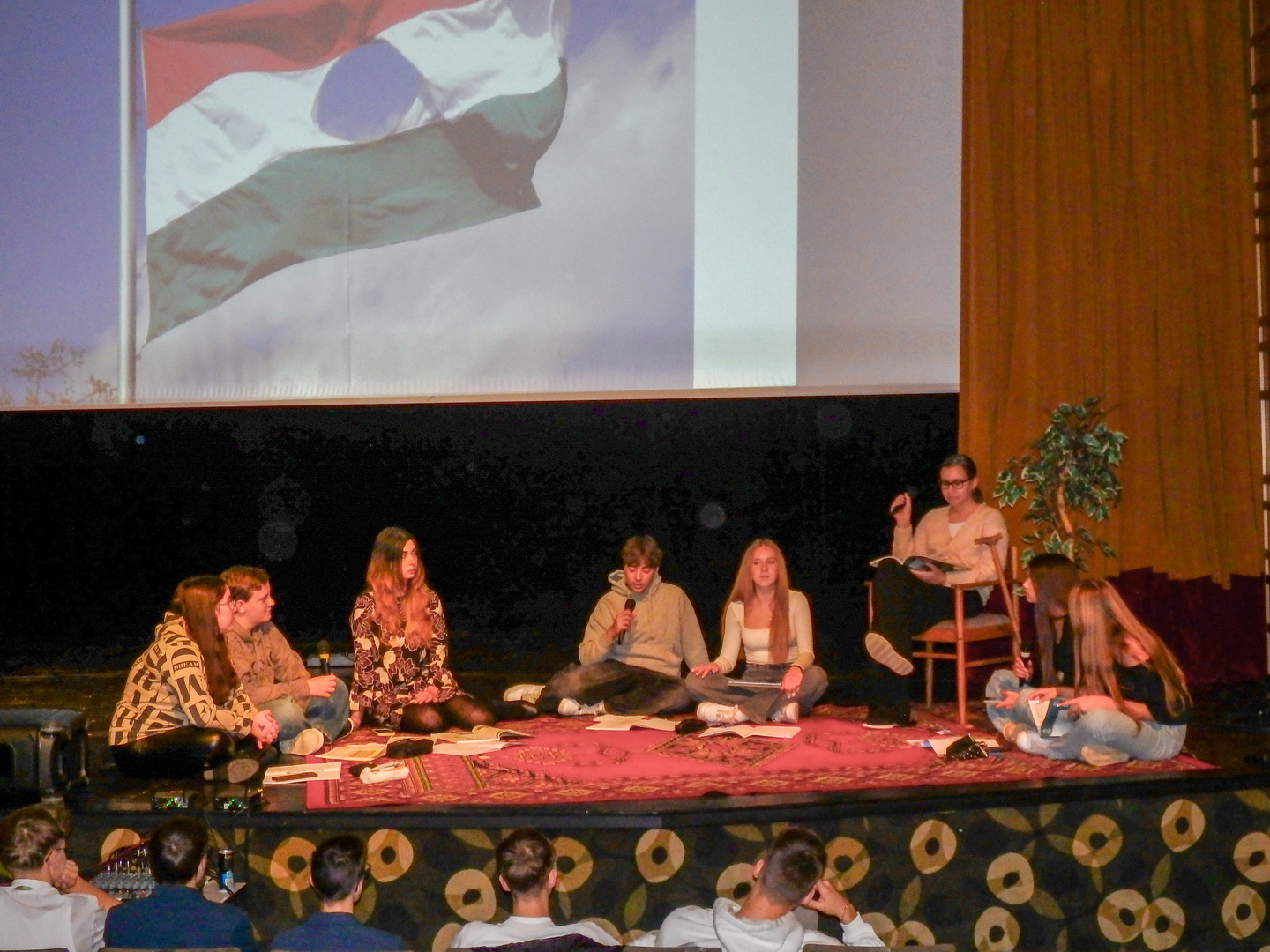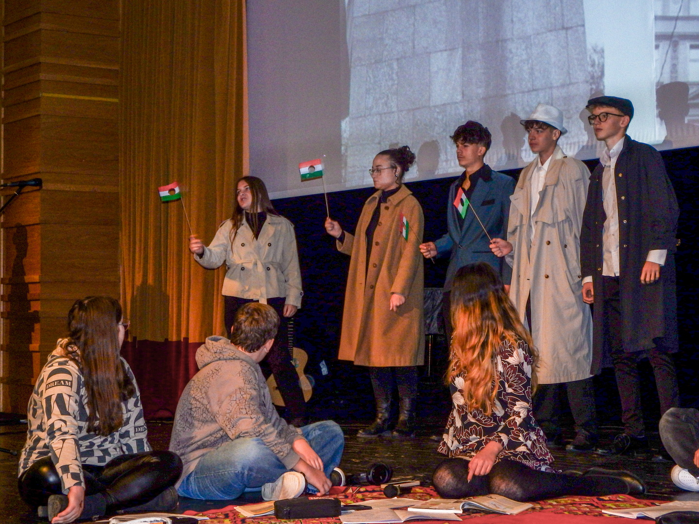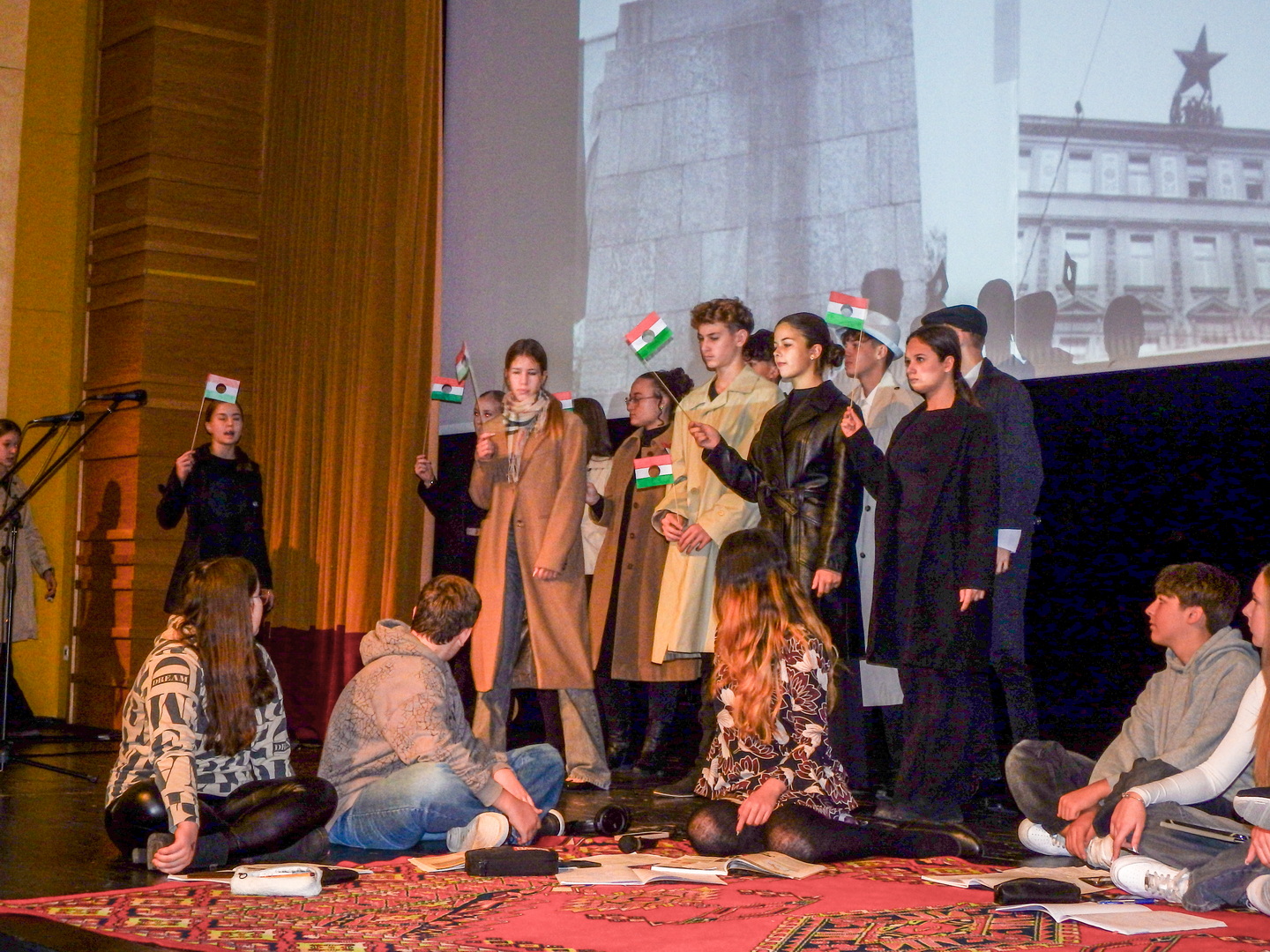 Méltóságteljes, sokoldalú, sok üzenetet hordozó megemlékezést tartott iskolánk az 1956-os forradalom és szabadságharc 69. évfordulója előtt tisztelegve. A Tinódi Ház nagytermét zsúfolásig megtöltő közönség számára a nagyszerű eredeti felvételek és filmrészletek hatására magyarázatot nyertek a forradalom kitöréséhez vezető okok, megelevenedtek a hősiesség, az áldozatvállalás eseményei, s azok aktív résztvevői. Hálás köszönetünket fejezzük ki a műsor megálmodóinak, Hilbert Henriett és Halmosi Anett tanárnőknek a műsor megszervezéséért. Köszönjük Dr.Csernák-Szuhányszki Debóra tanárnőnek a sok segítséget a megemlékezés összeállításában, valamint Bazsó Boglárka tanárnőnek, hogy segített a zenés produkció betanításában. Köszönjük a 9. évfolyam tanulóinak a részvételt. A műsor szereplői igazgatói dicséretben részesülnek: a 9.a osztályból: Frank Alexandra, Sámoly Panna, a 9.b osztályból: Bakó Márk, Fábián Kíra, Gelencsér Angéla, Glaub Hanna, Györgydeák Emma, Marosi Nimród, Papp Jázmin, Szabó Emília, Szabotin Soma, Szabó Albert Zétény, Szalai Csongor, Zrínyi Lorina, a 9.n osztályból: Bakó Petra, Börcsök Annabella, Darabos Rebeka, Kalász Laura, Kovács Anna, Marton Hanna, Molnár Kincső, Palánki Sára, Právics Réka, Szabó Panna, Takács Bence, Zelend Vivien. A rendezvény hangosítói a következő diákok voltak: a 9.n osztályból: Brunner Andor, Kovács Ákos, Lakatos Lőrinc, Péter Zsombor, a 12.a osztályból: Gerber Dániel, Szigeti Kornél.