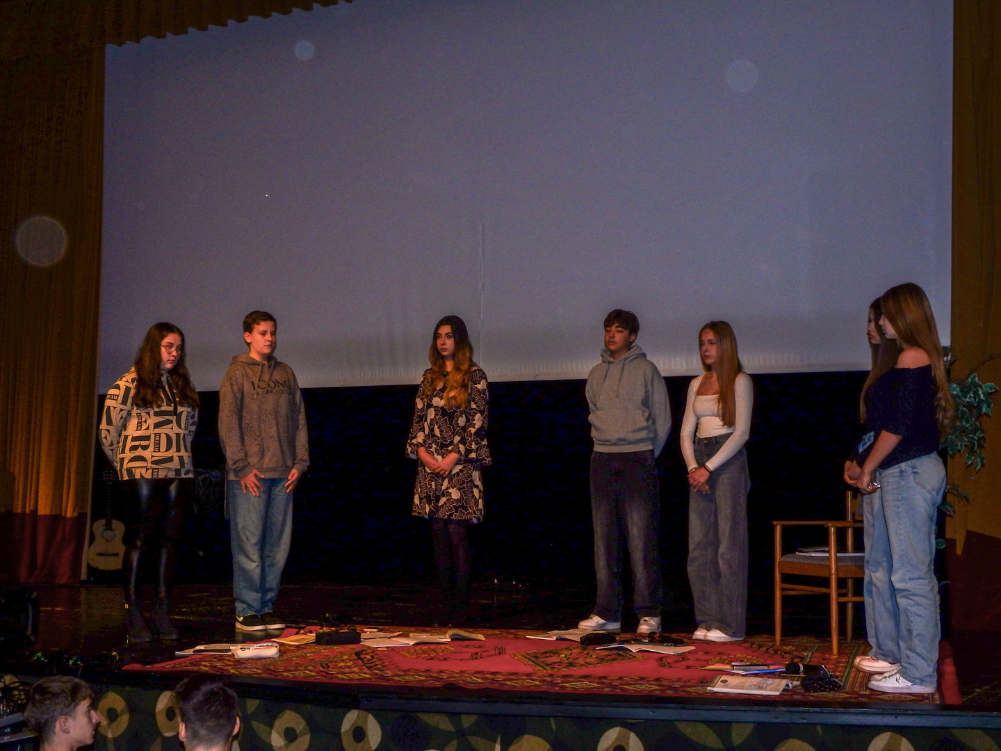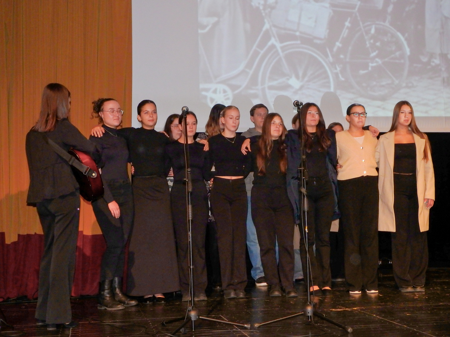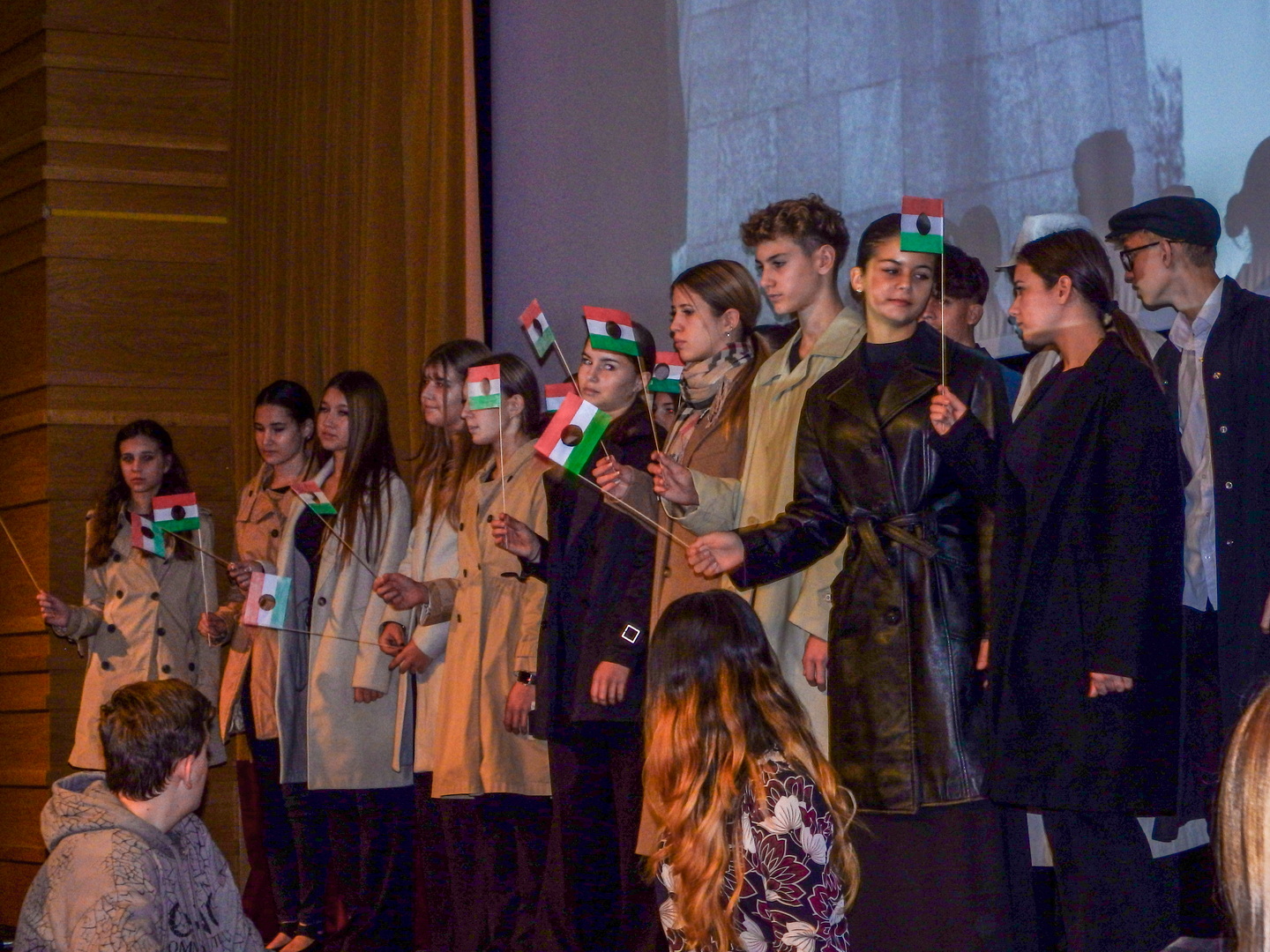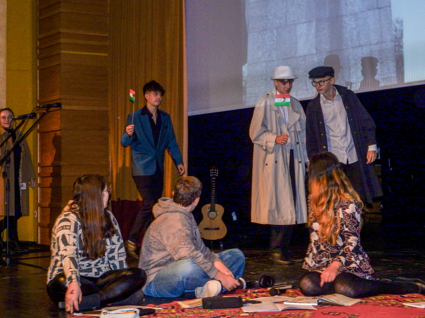 Méltóságteljes, sokoldalú, sok üzenetet hordozó megemlékezést tartott iskolánk az 1956-os forradalom és szabadságharc 69. évfordulója előtt tisztelegve. A Tinódi Ház nagytermét zsúfolásig megtöltő közönség számára a nagyszerű eredeti felvételek és filmrészletek hatására magyarázatot nyertek a forradalom kitöréséhez vezető okok, megelevenedtek a hősiesség, az áldozatvállalás eseményei, s azok aktív résztvevői. Hálás köszönetünket fejezzük ki a műsor megálmodóinak, Hilbert Henriett és Halmosi Anett tanárnőknek a műsor megszervezéséért. Köszönjük Dr.Csernák-Szuhányszki Debóra tanárnőnek a sok segítséget a megemlékezés összeállításában, valamint Bazsó Boglárka tanárnőnek, hogy segített a zenés produkció betanításában. Köszönjük a 9. évfolyam tanulóinak a részvételt. A műsor szereplői igazgatói dicséretben részesülnek: a 9.a osztályból: Frank Alexandra, Sámoly Panna, a 9.b osztályból: Bakó Márk, Fábián Kíra, Gelencsér Angéla, Glaub Hanna, Györgydeák Emma, Marosi Nimród, Papp Jázmin, Szabó Emília, Szabotin Soma, Szabó Albert Zétény, Szalai Csongor, Zrínyi Lorina, a 9.n osztályból: Bakó Petra, Börcsök Annabella, Darabos Rebeka, Kalász Laura, Kovács Anna, Marton Hanna, Molnár Kincső, Palánki Sára, Právics Réka, Szabó Panna, Takács Bence, Zelend Vivien. A rendezvény hangosítói a következő diákok voltak: a 9.n osztályból: Brunner Andor, Kovács Ákos, Lakatos Lőrinc, Péter Zsombor, a 12.a osztályból: Gerber Dániel, Szigeti Kornél.