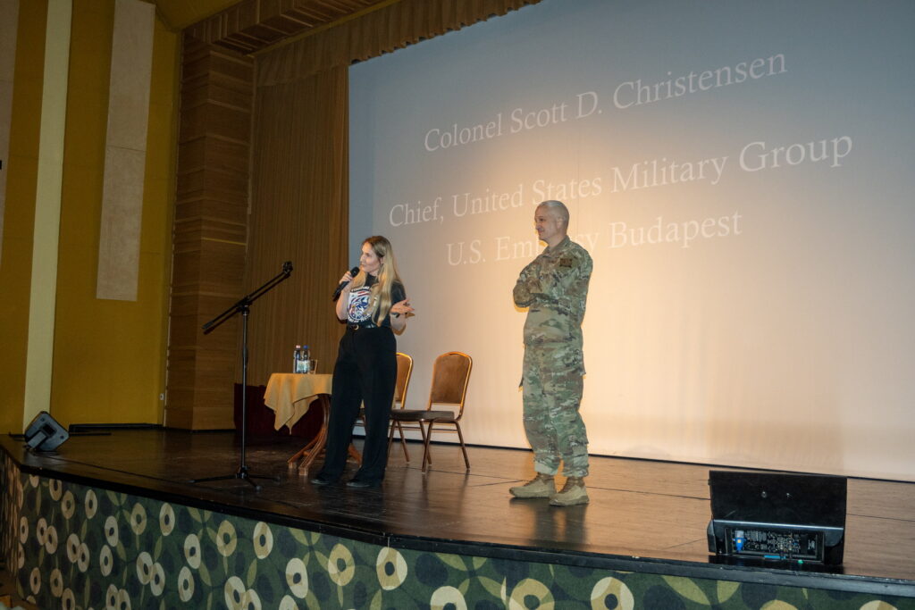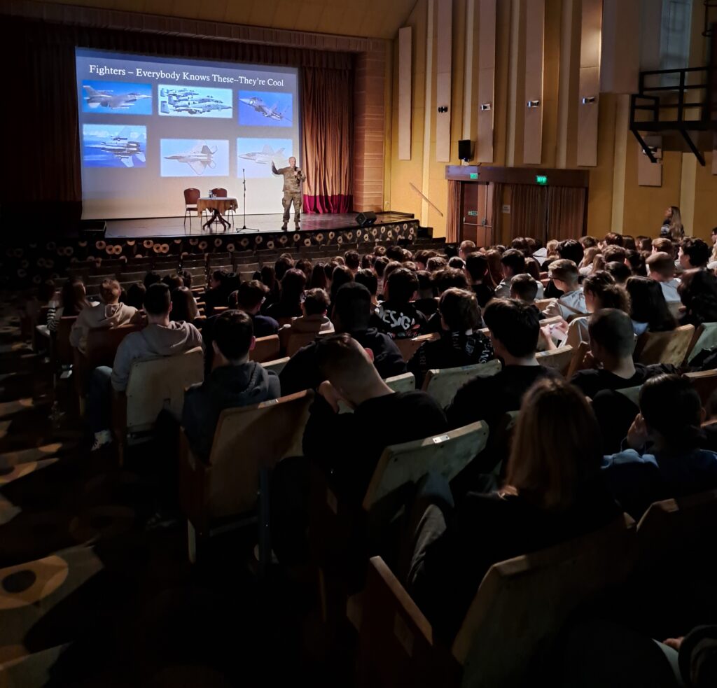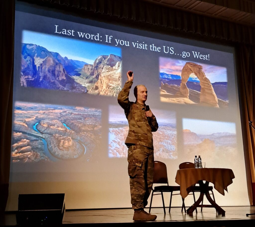 A budapesti Amerikai Nagykövetség által kínált programok közül idén az Air Force világába nyertek betekintést az érdeklődő diákok. A március 5-i találkozón Kovács Dóra oktatási koordinátorral Scott D. Christensen ezredes, az Amerikai Nagykövetség Katonai Osztályának vezetője érkezett hozzánk. Mesélt a saját munkájáról, majd bemutatta, hogyan épül fel a katonai védelmi szervezet. Az Air Force irányítóközpont munkája és a repülőgéptípusok, a repülési hadműveleteket megelőző előkészületek izgalmas témák voltak mindannyiunk számára. Előadónk közvetlen stílusa abban is megmutatkozott, hogy gyönyörű, az USA természeti kincseit bemutató képsorral zárta előadását, arra ösztönözve a hallgatóságot, mely helyekre látogasson el, ha az Egyesült Államokba tesz utazást.