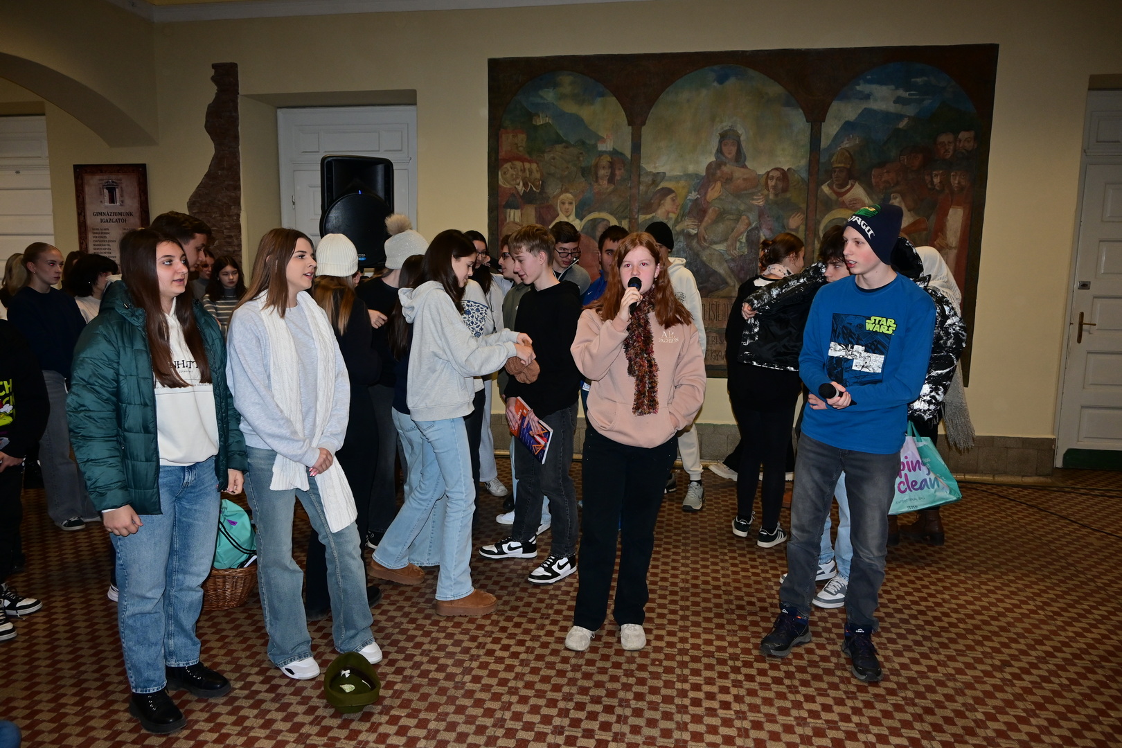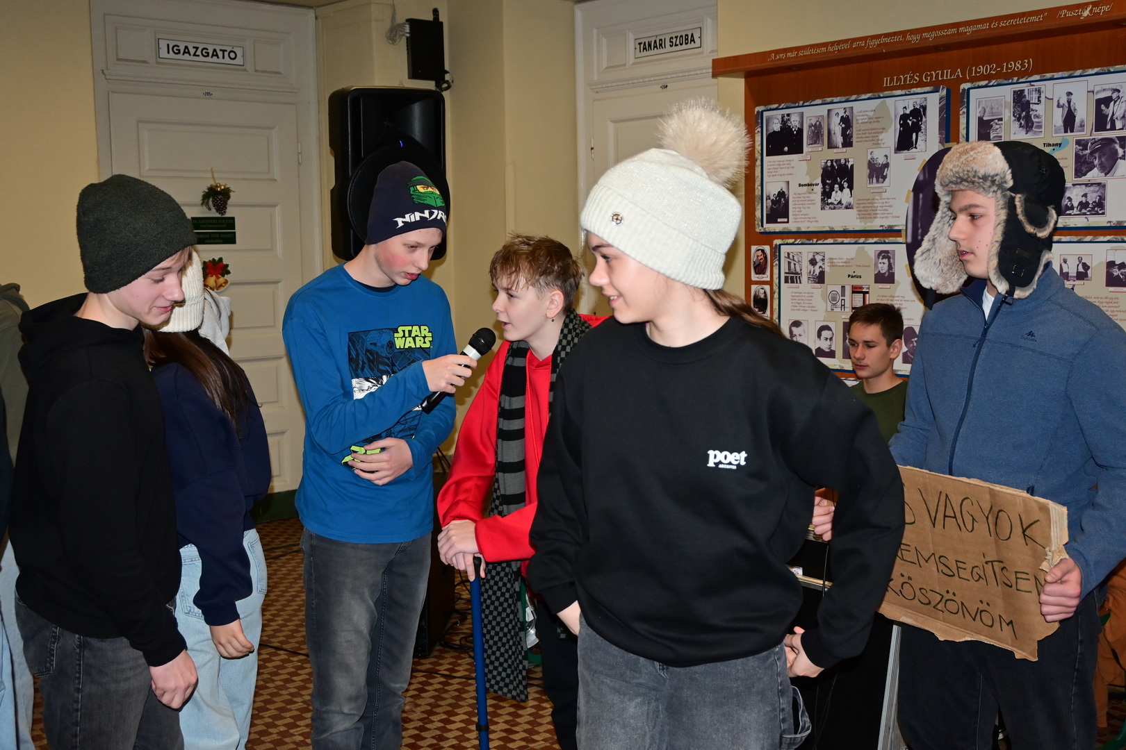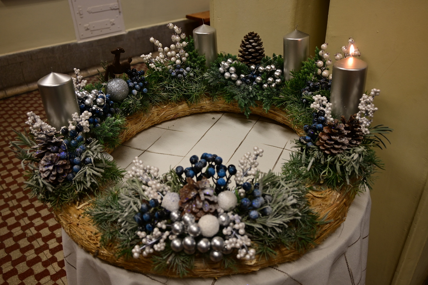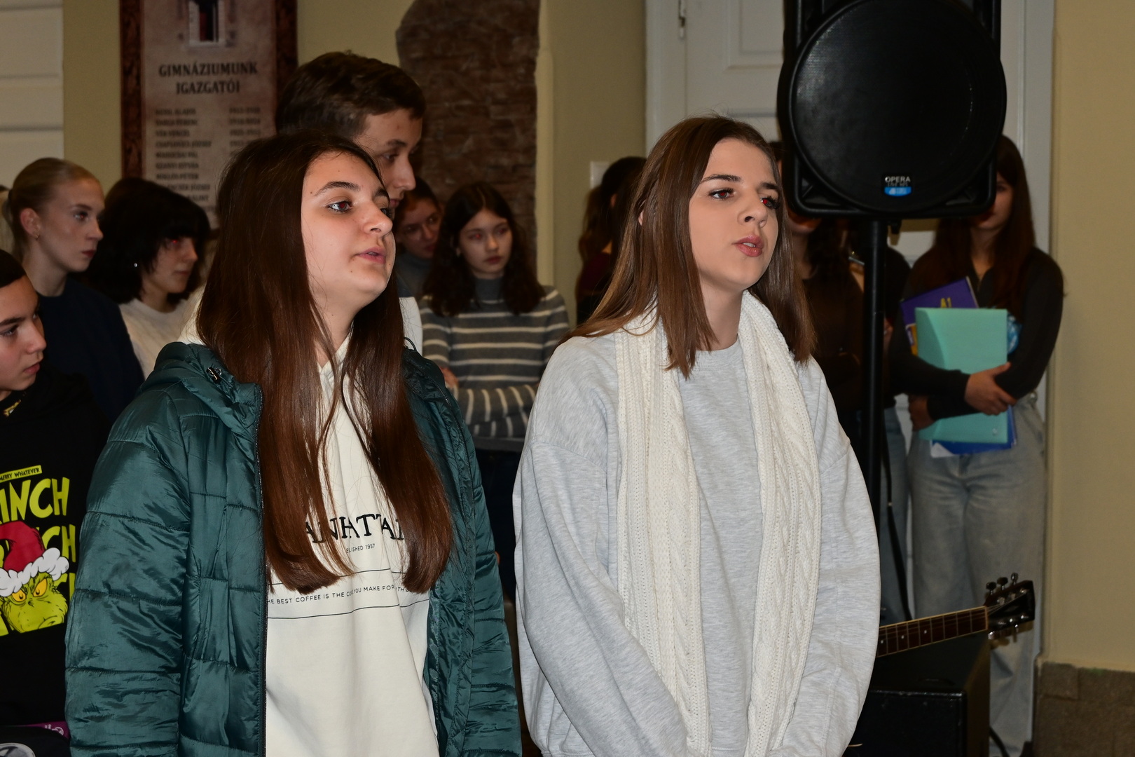 December elsején nyolcadikos diákjaink műsorával vette kezdetét iskolánkban az adventi várakozás. A diákok egy iskolai hétköznapot idéző jelenettel világítottak rá az ünnep, az elcsendesedés jelentőségére, melyet az osztály közös éneke követett Soós Gyopár tanárnő gitárkíséretével. Hálásan köszönjük! A produkciót követően került meggyújtásra az első gyertya az iskolai adventi koszorún, melyet Gyeneiné Rada Beáta tanárnő készített. Iskolánk épületében varázslatos ünnepi hangulat fogadja az ide betérőket. Hálás köszönet érte a díszítést készítő Gyeneiné Rada Beáta tanárnőnek és a neki segédkező dolgozóknak, diákoknak!