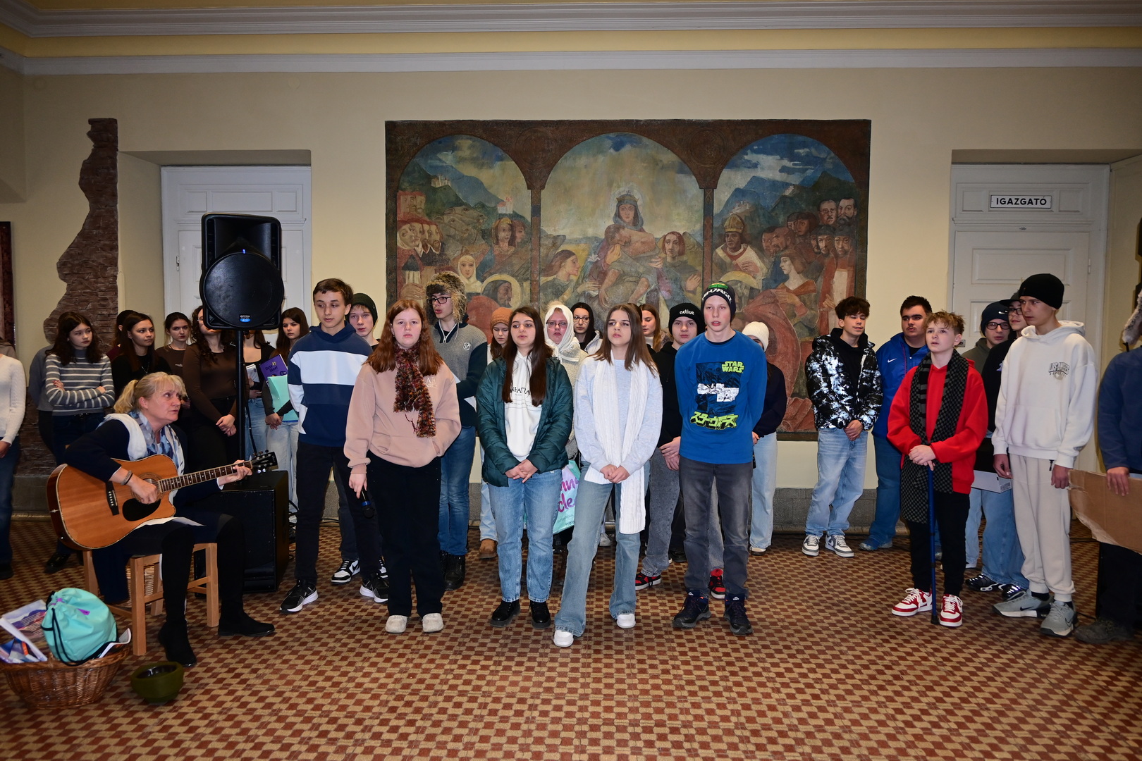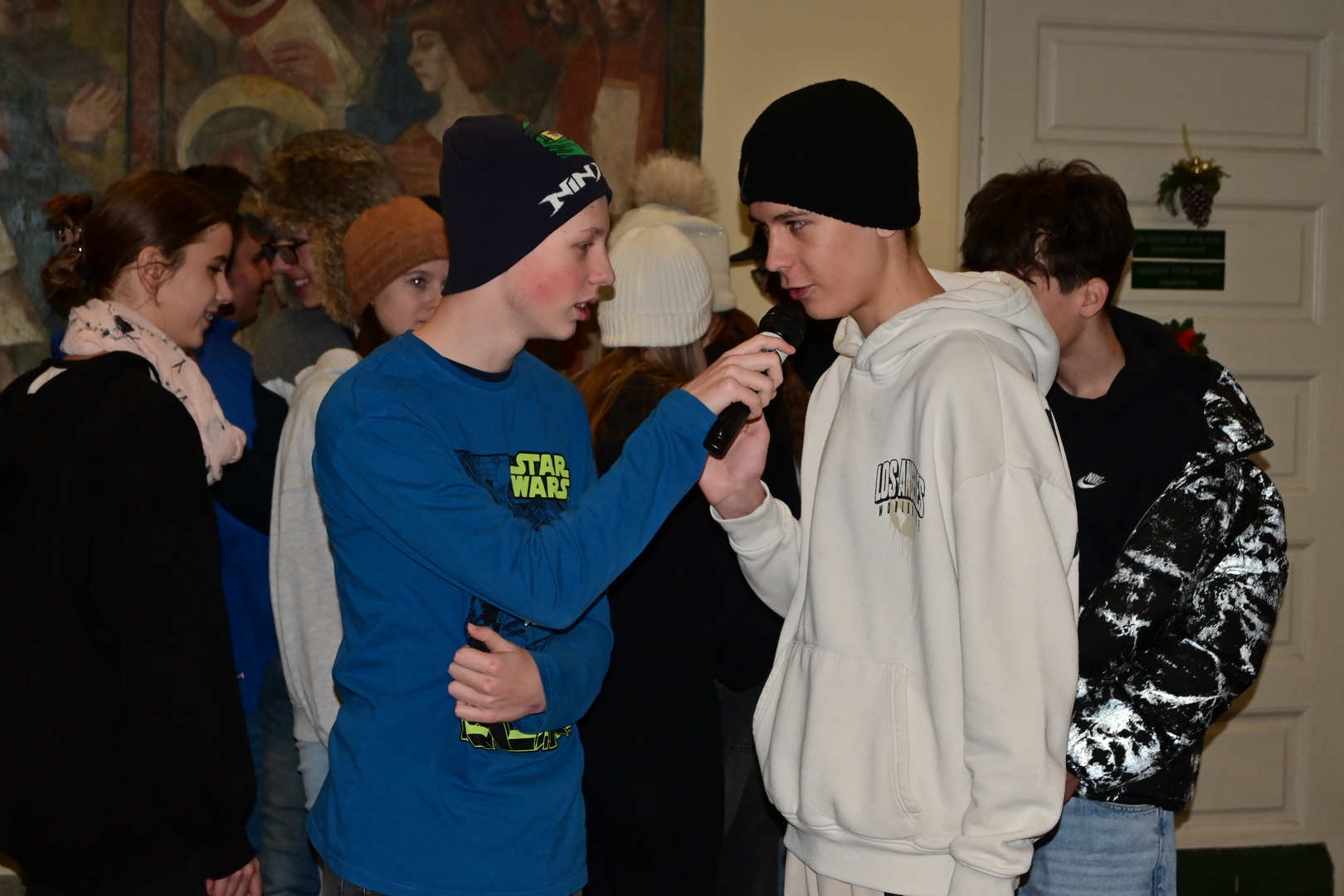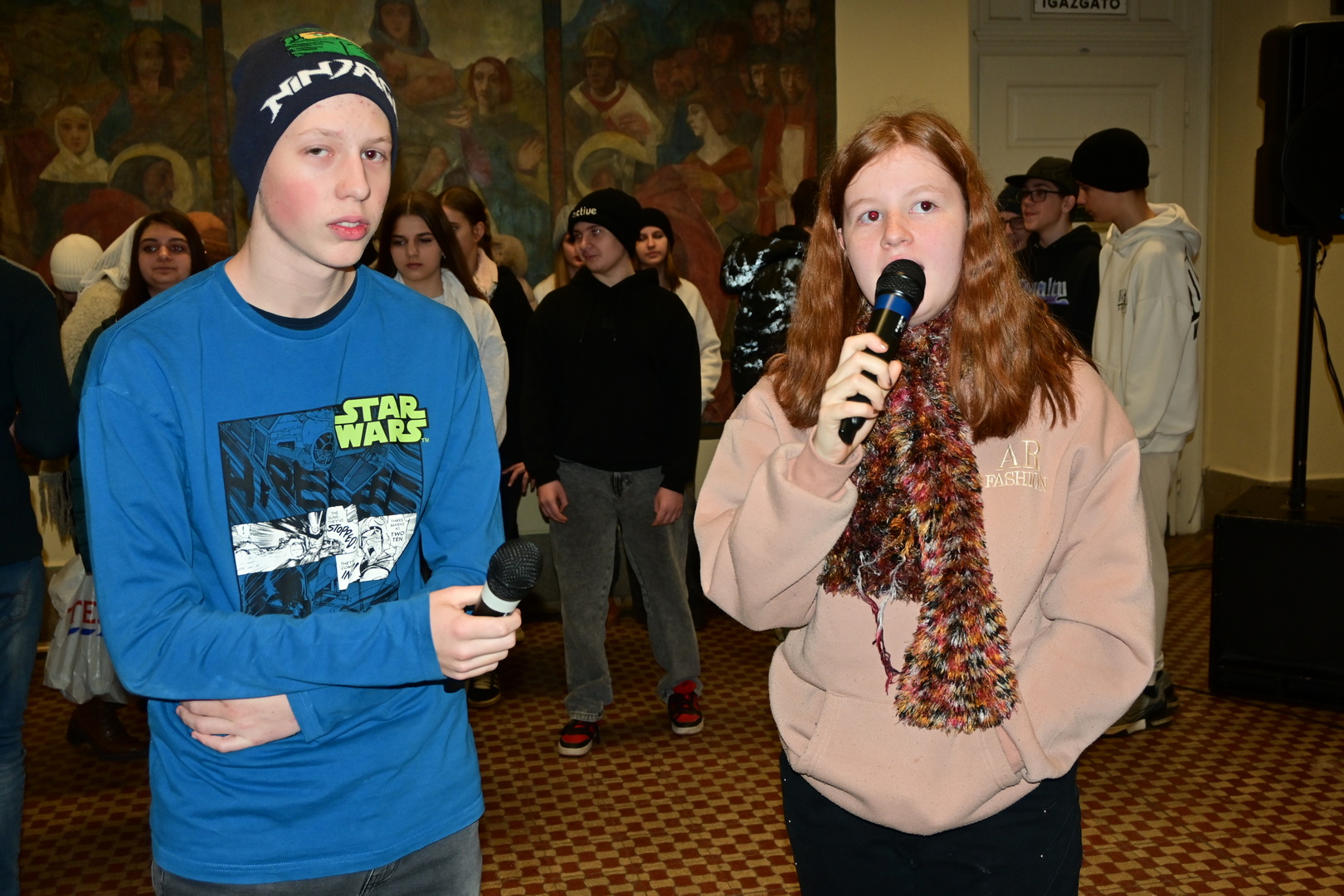 December elsején nyolcadikos diákjaink műsorával vette kezdetét iskolánkban az adventi várakozás. A diákok egy iskolai hétköznapot idéző jelenettel világítottak rá az ünnep, az elcsendesedés jelentőségére, melyet az osztály közös éneke követett Soós Gyopár tanárnő gitárkíséretével. Hálásan köszönjük! A produkciót követően került meggyújtásra az első gyertya az iskolai adventi koszorún, melyet Gyeneiné Rada Beáta tanárnő készített. Iskolánk épületében varázslatos ünnepi hangulat fogadja az ide betérőket. Hálás köszönet érte a díszítést készítő Gyeneiné Rada Beáta tanárnőnek és a neki segédkező dolgozóknak, diákoknak!