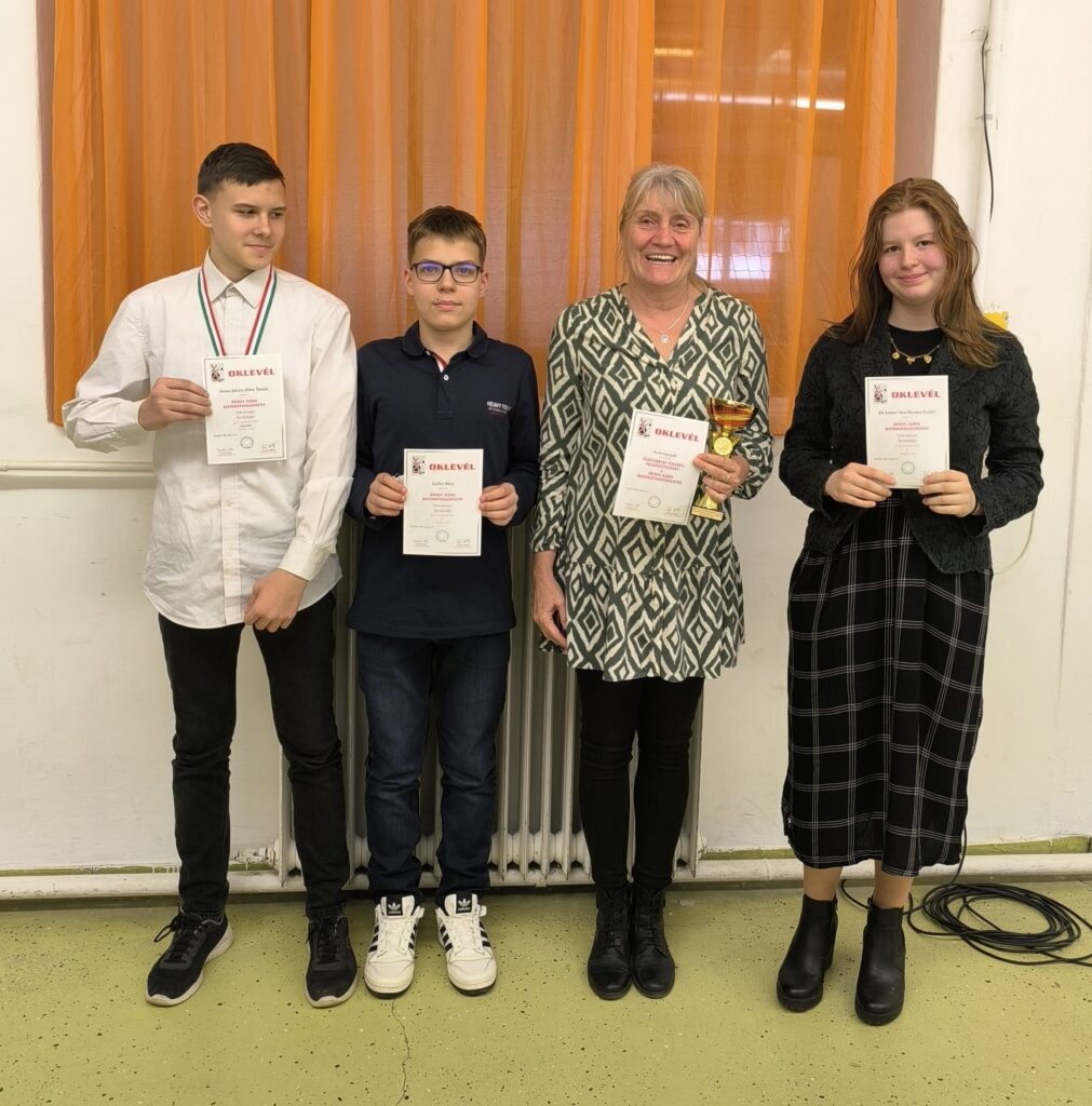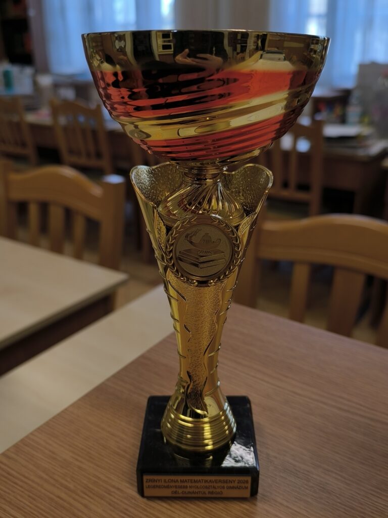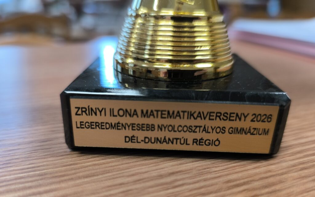 Március 18-án tartották a Zrínyi Ilona Matematikaverseny ünnepélyes megyei eredményhirdetését. A 2-8. évfolyamon minden kategóriában a legeredményesebb tíz tanulót díjazták. Sutus-Juhász Péter Tamás 7. osztályos tanulónk a nagyszerű 3. helyezést érte el évfolyamán. Geller Ákos (7.n) és De Leeuw Van Weenen Eszter (8.n) szintén kiváló eredménnyel 5. helyezett lett. A 9-12. évfolyamon csak az első helyezetteket hívták meg az ünnepélyre. Apáti Márk, 10.n osztályos tanulónk csak 2 ponttal maradt le az első helyről, így idén sajnos nem jutott az országos döntőbe. További kiemelkedő eredmények: Gáspár Emma (10.n) 5., Vincze Szilvia (10.n) 7. helyezett lett. A tanulók matematika tanára Soós Gyopár, aki oklevelet vehetett át tanítványai felkészítéséért. Idén – már többedik alkalommal – elnyertük a  Dél-Dunántúl Régió legeredményesebb nyolcosztályos gimnáziuma címet is. Szeretettel gratulálunk az kimagasló eredményekhez! A tanulók osztályfőnöki dicséretben részesülnek.