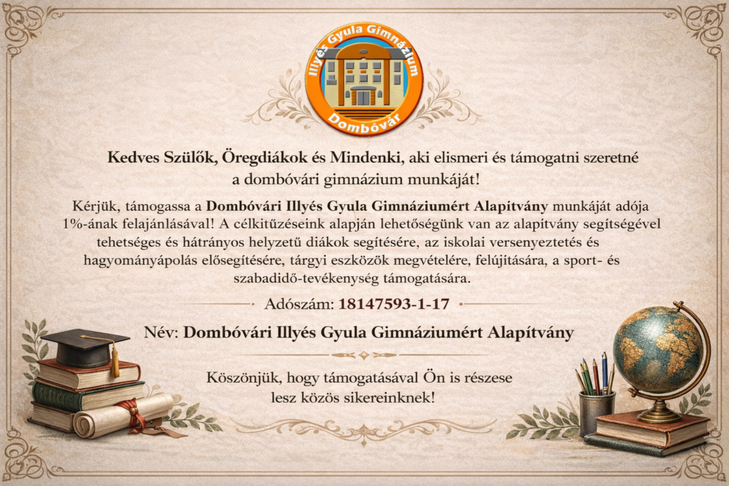 6 napja 2026.01.29.2026.01.29.leviboy01 Támogassa a Dombóvári Illyés Gyula Gimnáziumért Alapítvány munkáját adója 1%-ának felajánlásával
